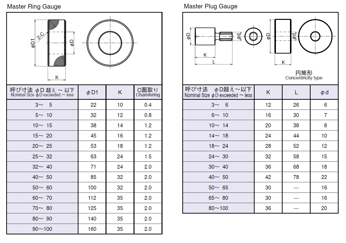 The master gauges are used for adjusting comparator type measuring instrument and air jet. We provide master gauges with high accuracy produced using zero treatment for preventing the gauges from secular distortion.