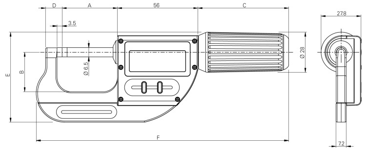 Automatic wake-up by moving the measuring spindle. S.I.S Sleeping mode after 20 min. of no use. S.I.S Position memorized in sleeping mode. S.I.S Water protected for heavy-duty work with coolants and lubricants, protection rating IP67 according to IEC 60529, with or without connector Measuring range 0-102 mm covered with 3 instruments only (0-30, 30-66, 66-102) Set of 3 micrometers 0-102 mm available Quick displacement of the measuring spindle 12 mm / rotation Adjustable measuring force 5N / 10N Repeatability and reproducibility unequalled Battery life: 12’000 hours continuous Thimble made of Delrin®